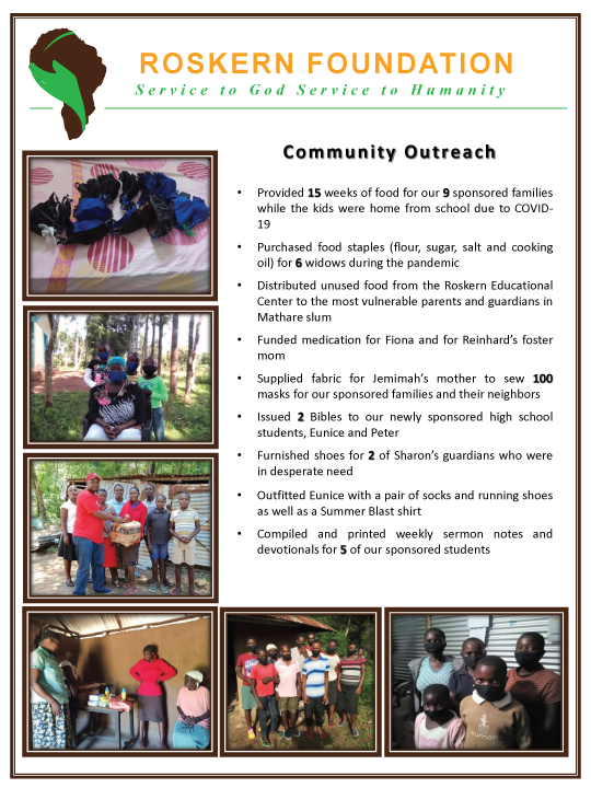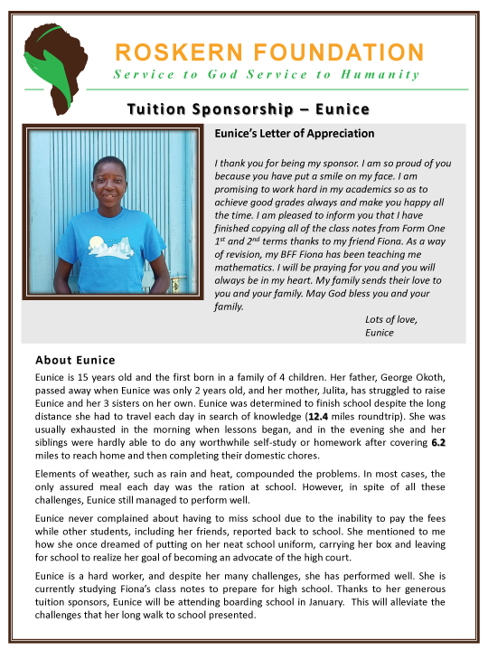The Roskern Foundation provides updates on how funding is used via newsletters, Facebook and the website. Donors who participate in the tuition sponsorship program receive pictures of the child they sponsor, report cards each semester and personal correspondence from the child.