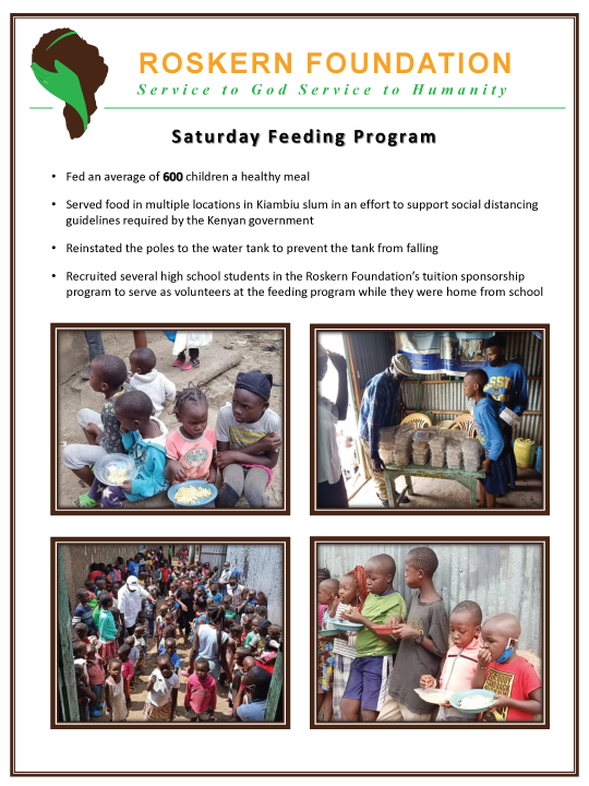 We reworded this a little bit. “Roskern Foundation Feeding Programs provide daily meals at the Roskern Educational Centre in Mathare Slum and a meal to children in Kiambiu Slum on Saturdays. Your donation of $20 subsidizes student meals for one day, and $160 finances the weekly Saturday feeding program.”